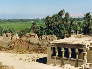 Dendera, ca. 60 km nördlich von Luxor, war der Hauptkulturort der kuhohrigen Göttin Hathor – hier stand bereits im frühen Alten Reich ein Heiligtum. Erst im 1. Jahrhundert v. Chr. wurde wurde der heute zu besichtigende Tempel errichtet. Er ist noch sehr gut erhalten, auch das Tempeldach konnte bewahrt werden. Mit Hathor zusammen wurden auch ihr Gemahl Horus, der Falkengott, und ihr Sohn Ihi, Gott der Musik verehrt.