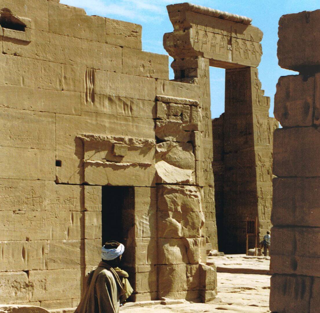 Der gewaltige Tempel von Edfu ist der besterhaltene Tempel Ägyptens. Obwohl der Tempel aus der ptolemäischen Zeit stammt, vermittelt er einen guten Eindruck pharaonischer Architektur. Er war dem Gott Horus geweiht, der im großen Hof als Riesenfalke mit pharaonischer Doppelkrone dargestellt. Imposant ist beim Tempel von Edfu auch die Umfassungsmauer, die die gleiche Höhe wie der Tempel selbst hat. Die Innenwände sind voll von den Darstellungen des Horus-Mythos: der Gott Horus kämpft gegen den als Nilpferd dargestellten Gott Seth, der Mörder seines Vaters Osiris.